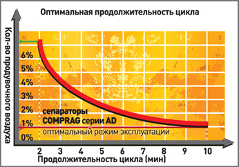 Адсорбционные осушители Comprag работают с оптимальной для эксплуатации продолжительностью цикла в 10 минут. Уменьшение количества циклов осушка-продувка уменьшает эксплуатационную нагрузку на ресиверы, запорную арматуру и десикант. Кроме того, продолжительный цикл работы уменьшает потери давления воздуха на восстановление рабочего давления в ресивере, перешедшем в режим осушки: При двухминутном цикле осушка-продувка на восстановление рабочего давления в ресивере тратится около 7,5% от осушаемого сжатого воздуха.