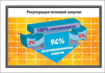 - 2% — потери на тепловое излучениеДо 94% от затраченной на привод компрессора электроэнергии можно использовать вторично в виде рекуперированного тепла.